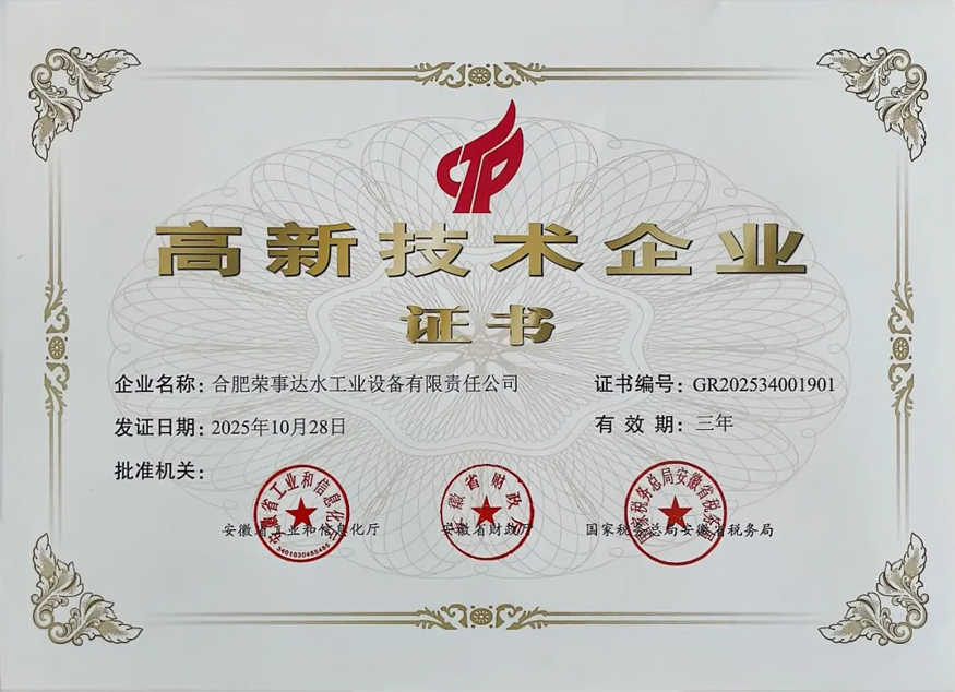 合肥荣事达水工业设备有限责任公司通过高新技术企业认定,荣获由...